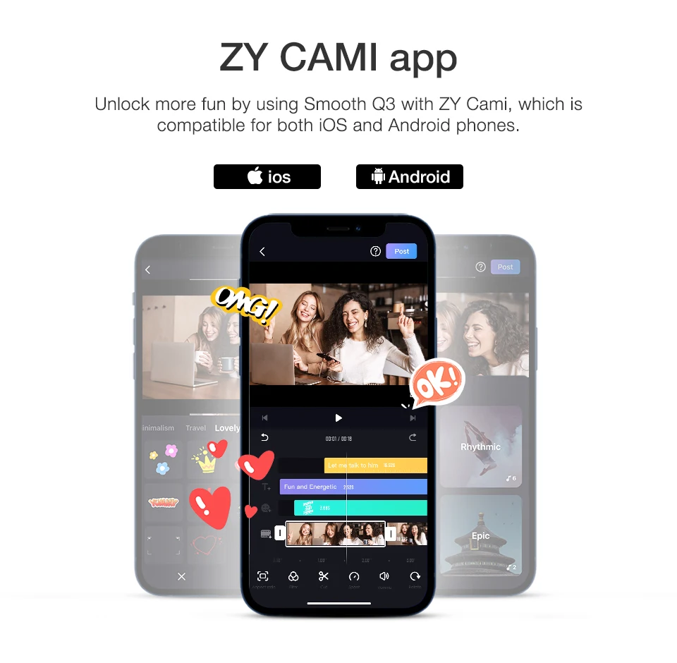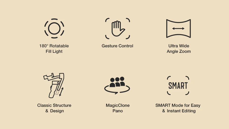 [Recursos Cinematográficos Profissionais no Aplicativo ZY Cami]: Selecione câmera lenta, zoom dolly, modo de início, panorama 360° ou modo lapso de tempo e siga as dicas na tela para criar sua próxima obra-prima. O ZY Cami também oferece uma ampla variedade de modelos de filmagem criativos integrados para tornar a criação do seu próximo filme fácil e divertida.