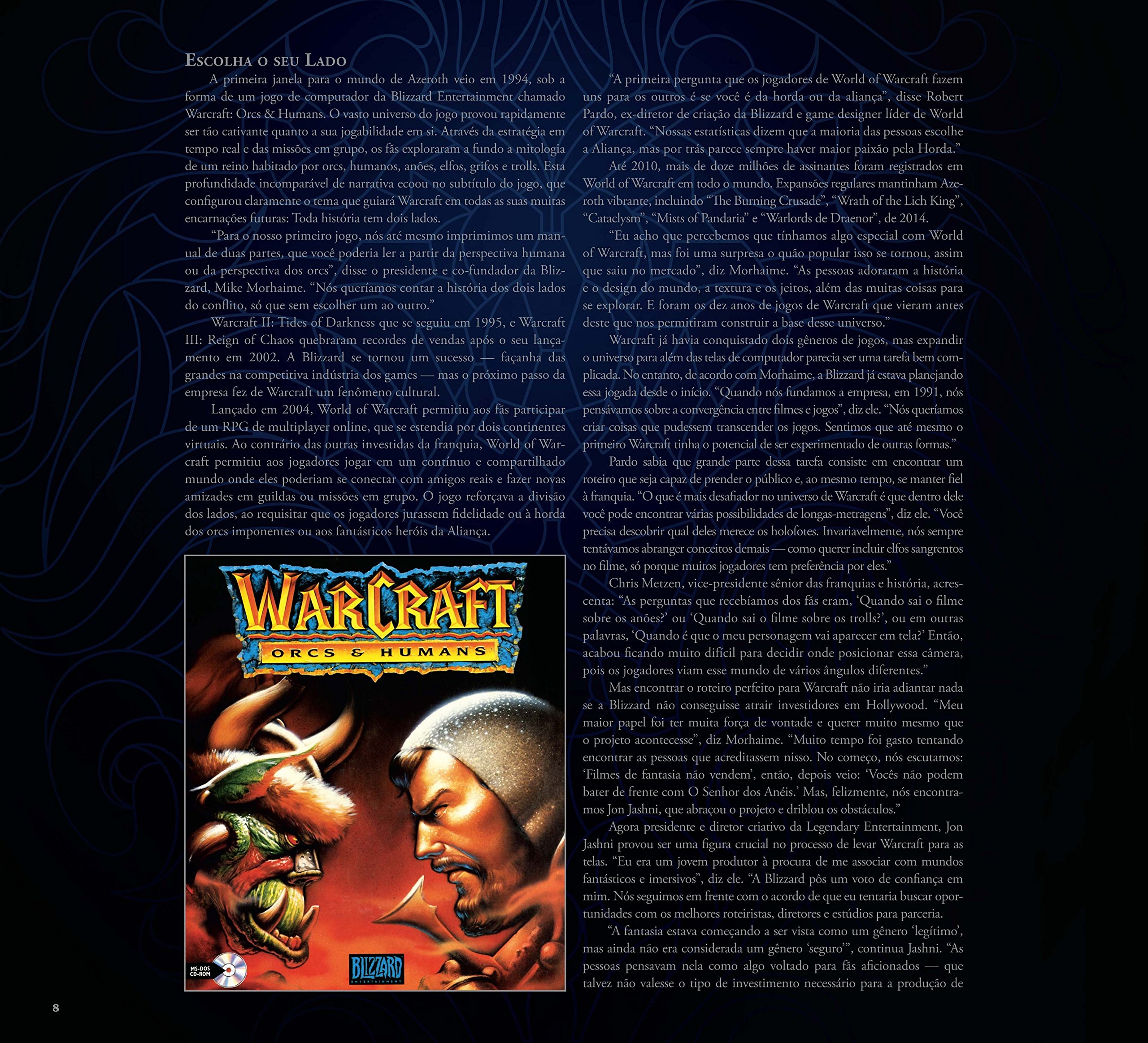 2. Não posso revelar todos os detalhes da obra Warcraft: Por Trás do Portal Negro, publicado pela Editora Pixel, para não estragar as surpresas contidas em cada página, mas afirmo que a qualidade de todo o conjunto da obra é de tirar o fôlego e digna de se ter na estante, tanto pelo próprio conteúdo, quanto por sua beleza.